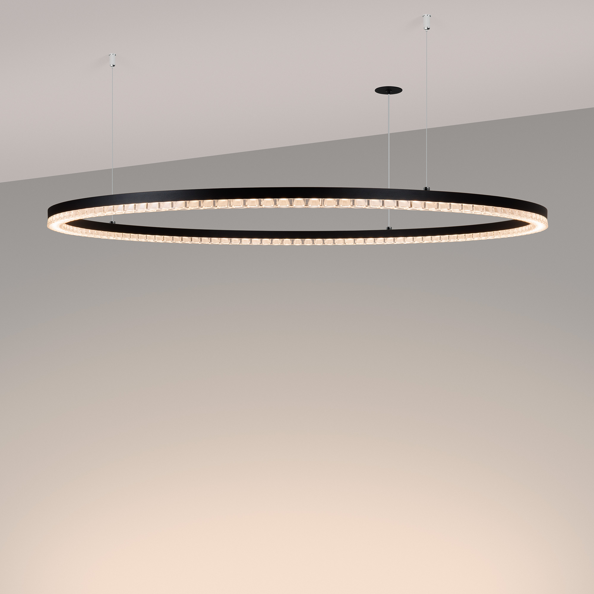 Подвесной светильник. Мощность 60 Вт, св. поток 5070 лм, 80-95 лм/Вт, теплый 3000 K, CRI>90, угол 45°, напряжение питания 230 В. Черный круглый корпус из алюминия, экран PMMA, степень защиты IP20. Размер: диаметр 1050 мм, высота 34 мм, ширина профиля 30 мм, размер чаши: диаметр 65 мм, высота 26 мм. Монтаж подвесной, длина подвеса 1200 мм, тип чаши встраиваемый, диаметр установочного отверстия чаши 60 мм. Драйвер (2 шт) 9-42 В, 700 мА. Пульсация <0,3 %.