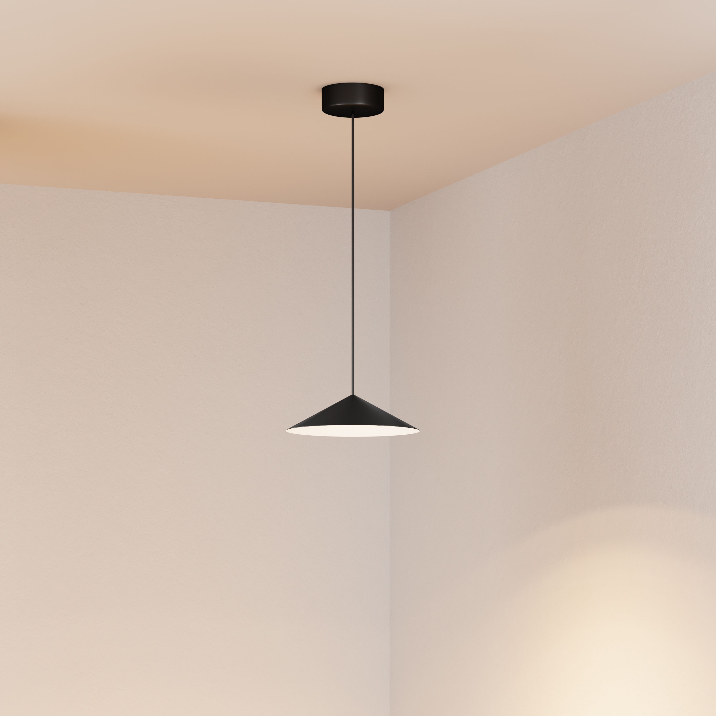 Подвесной светильник. Мощность 10 Вт, св. поток 700 лм, 70лм/Вт, теплый 3000 K, CRI>94, угол 36°, напряжение питания 230 В. Черный корпус из алюминия в форме конуса с белой внутренней поверхностью, линза-рассеиватель из PMMA, степень защиты IP20. Размер: диаметр 300 мм, высота 80 мм. Монтаж подвесной, длина подвеса 2000 мм, регулируемая. В комплекте две чаши. Габариты чаши (встроенной) Ø80 х 41 мм, врезное отверстие Ø55 мм, габариты чаши (накладной) Ø110 х 25 мм. Драйвер 2,8-12В, 500мА, пульсация <1%. Управление по TRIAC.