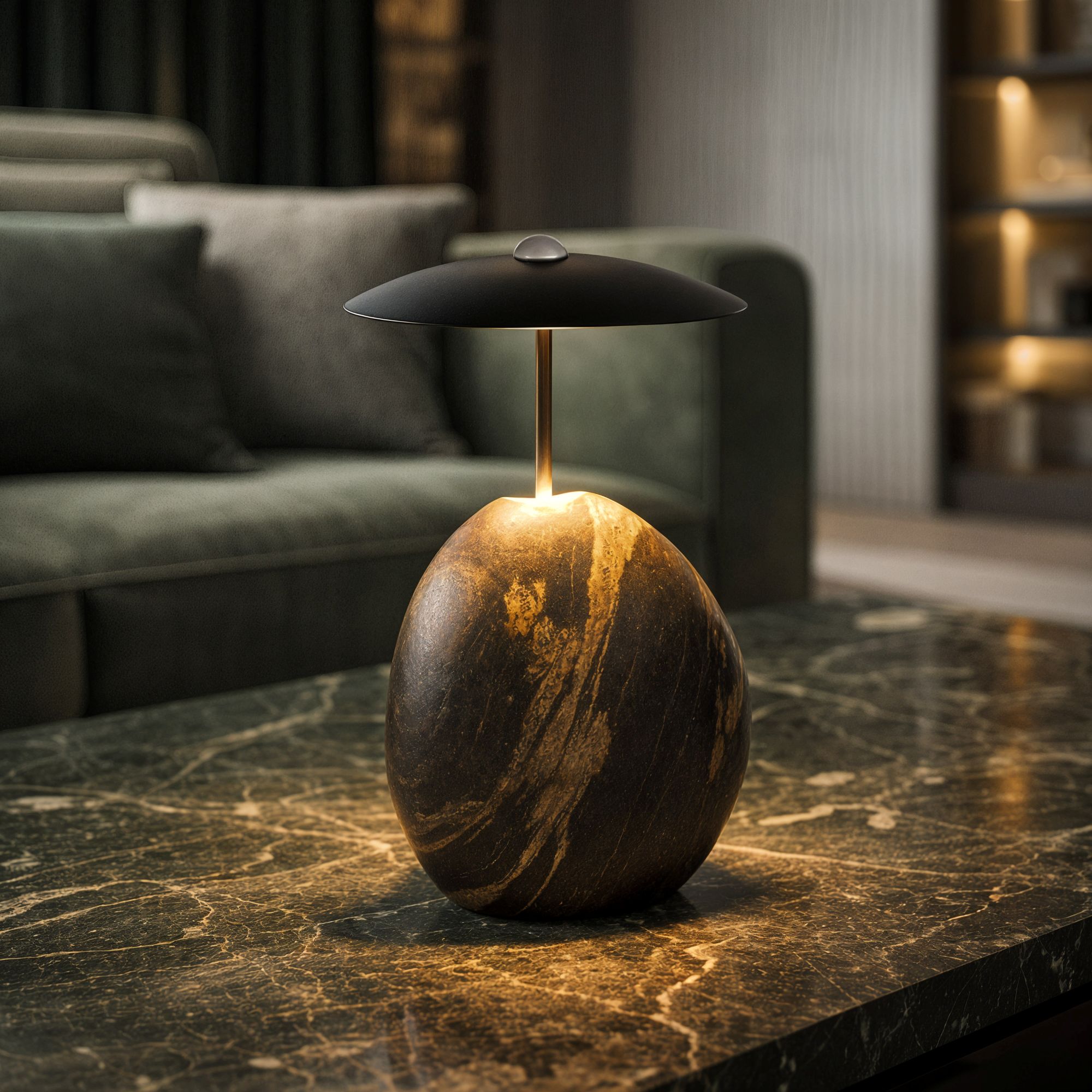 Настольный светильник UMANI. Мощность 6 Вт, св. поток 10,4 лм, 2 лм/Вт, теплый 2700К, CRI>92, угол 90°, напряжение питания 230 В. Черный рессеиватель из металла. Основание светильника выполнено из натурального камня, каждый экземпляр уникален своей неповторимой формой и текстурой. Степень защиты IP20. Диаметр рассеивателя: 250 мм. Общая высота: 340 мм. Высота основания: 190 - 230 мм. Диаметр основания: 160 - 200 мм. Длина кабеля 2м. Пульсация <5%.